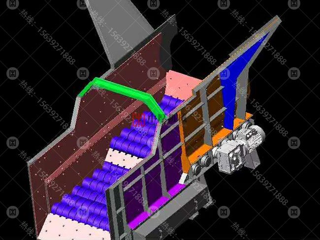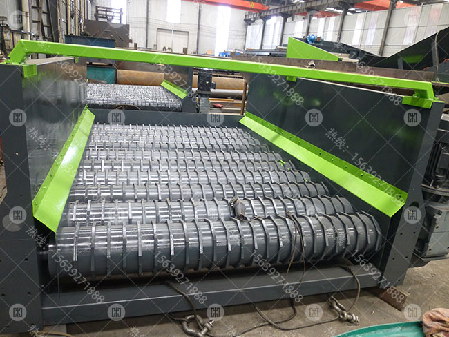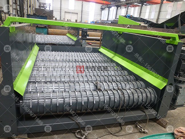 由電機(jī)驅(qū)動(dòng)帶有不規(guī)則的形狀裝置的連動(dòng)軸進(jìn)行翻轉(zhuǎn)運(yùn)動(dòng),篩面由很多根直線排布回轉(zhuǎn)軸承構(gòu)成,在滾軸上有相等的篩盤排布,滾軸通過(guò)齒輪帶動(dòng)輪鏈傳動(dòng)而旋轉(zhuǎn)的,其旋轉(zhuǎn)的的方向與原料流動(dòng)的方向一致,軸與軸之間有間隙,鑲嵌在軸上的不規(guī)則耐磨裝置托起大粒度物料向前運(yùn)動(dòng),因?yàn)楹Y軸是按各不相同的運(yùn)行方向設(shè)計(jì)的,所以當(dāng)材料在運(yùn)行方向較高的地方運(yùn)行時(shí)的速度較快;當(dāng)材料在運(yùn)行方向較低的地方運(yùn)行時(shí)的速度較低緩。兩種各不相同的速度運(yùn)行下的材料,在篩面某一地方相匯時(shí)開(kāi)始做軸向運(yùn)作,如此一來(lái)就使材料均衡性地分布在篩面上,達(dá)到了提高篩分的工作效率,小顆粒物料則落入分離機(jī)底部由皮帶機(jī)送出。