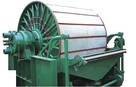 外濾式真空過濾機筒體的外表面用隔條沿圓周方向分成一定數(shù)量的軸向貫通的過濾室,室與室之間嚴格地密封,互不通氣。過濾室里鋪設(shè)過濾板,一方面形成通道以便流通濾液;另一方面起著支撐過濾布的作用。整個筒體外面包裹著濾布,筒體內(nèi)部由真空泵抽成負壓,礦漿槽中的礦漿在壓力差的作用下透過濾布形成濾液,國體顆粒被阻留在濾布上成為濾餅?為了保證每室之間的密封,濾布用膠條、麻繩或棕繩嵌在隔條的繩槽內(nèi)。然后再用繞線機構(gòu)在筒體外面沿軸向以50-80mm的間距纏繞很多道鋼絲,把濾布固定在筒體上。